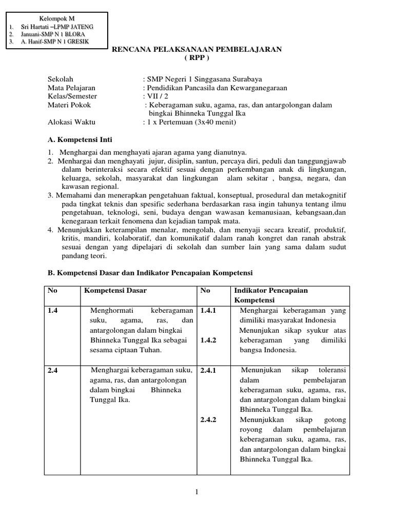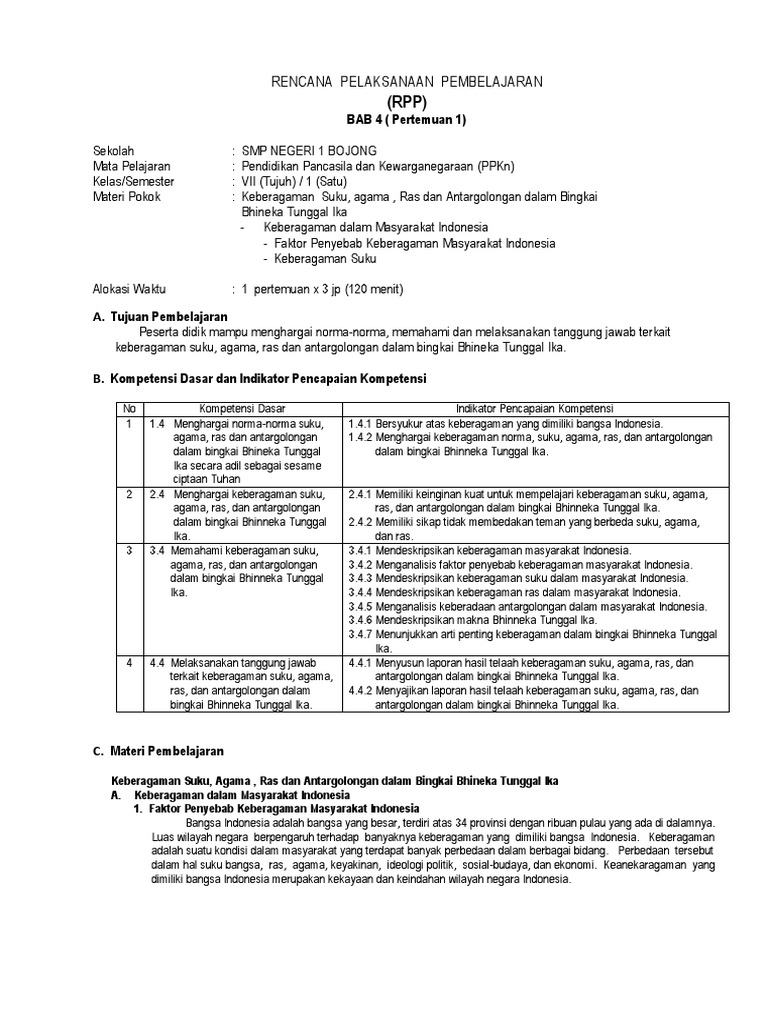 RPP SATU LEMBAR PPKn KELAS 7 SEMESTER 2 BAB 4 KEBERAGAMAN SUKU …