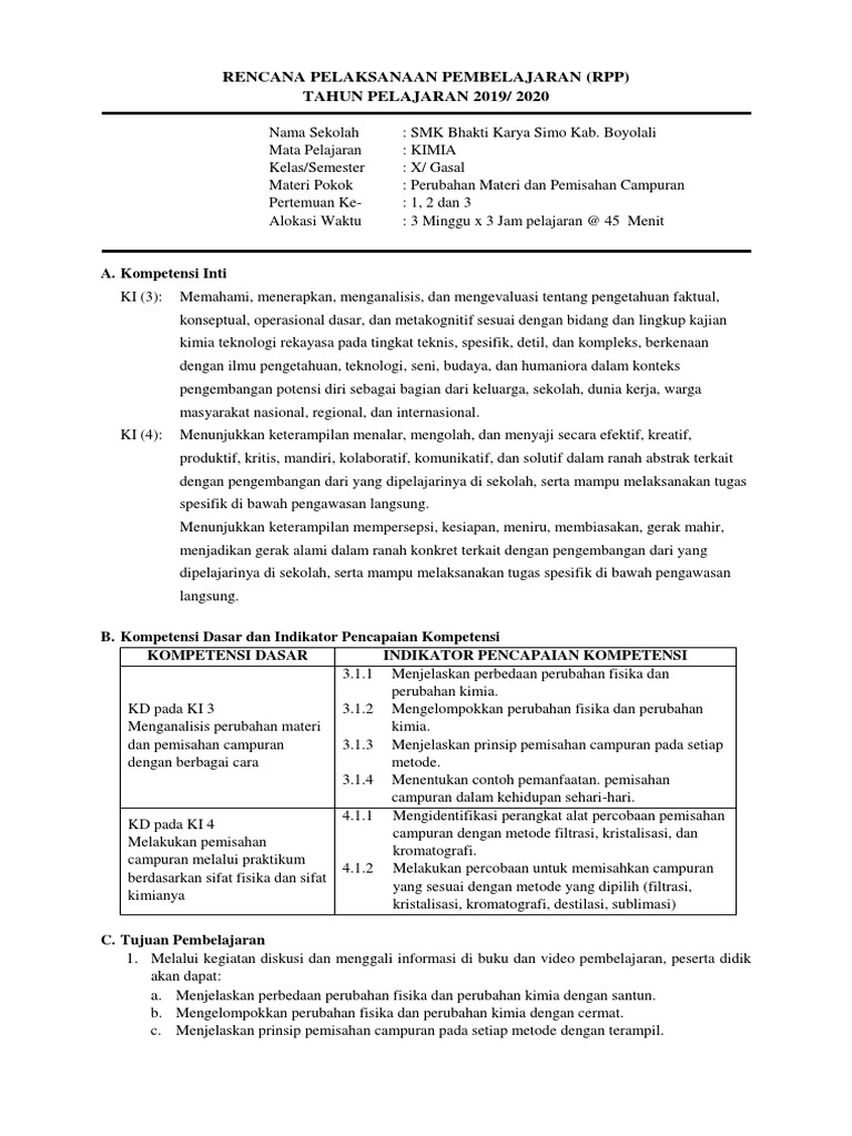 Rpp Kimia x KTR K13 - Perubahan Materi dan Pemisahan Campuran