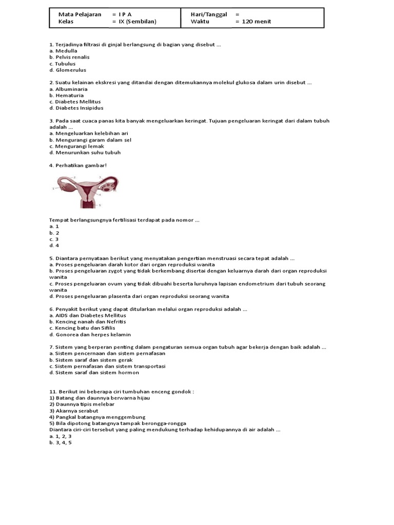 Mata Pelajaran Kelas = Ipa = IX (Sembilan) Hari/Tanggal Waktu = = 120 menit