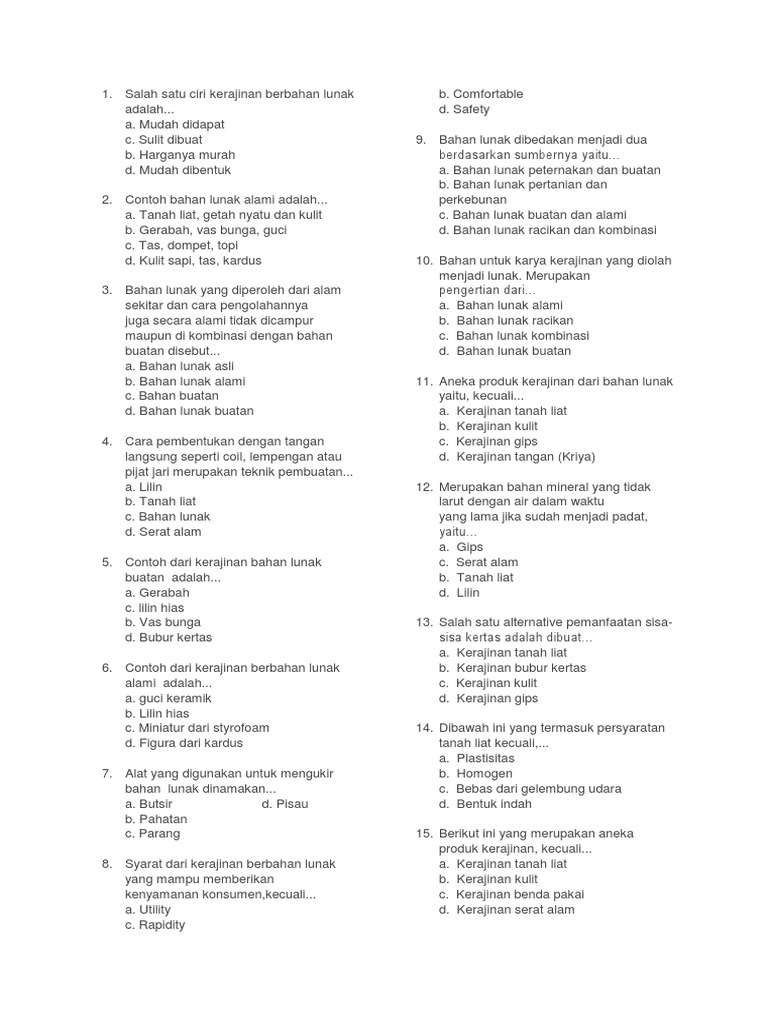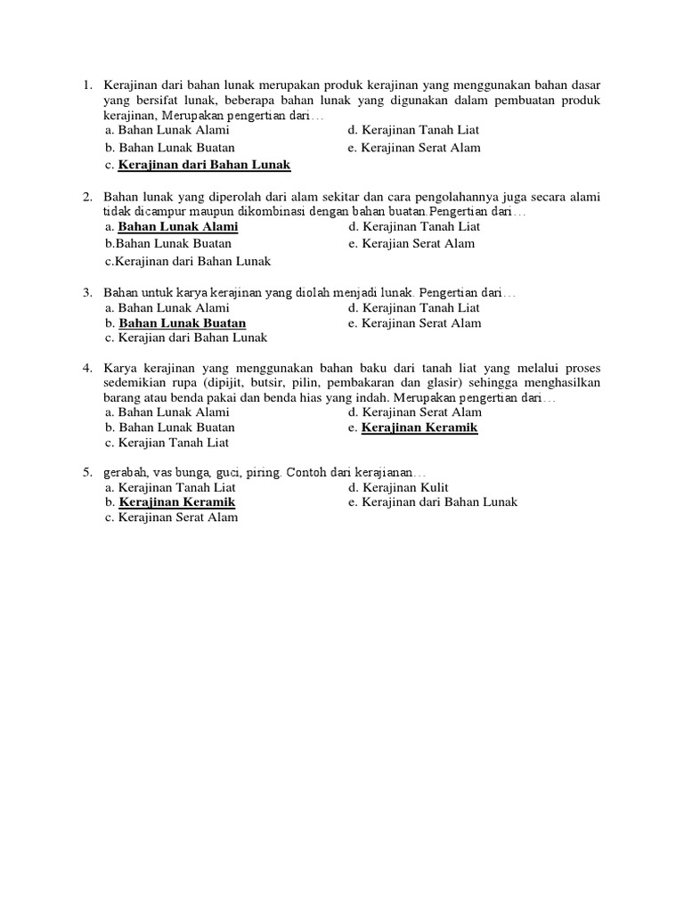 Bahan untuk karya kerajinan yg diolah menjadi lunak. Pengertian dari? A. Bahanlunak alami B. - Brainly.co.id