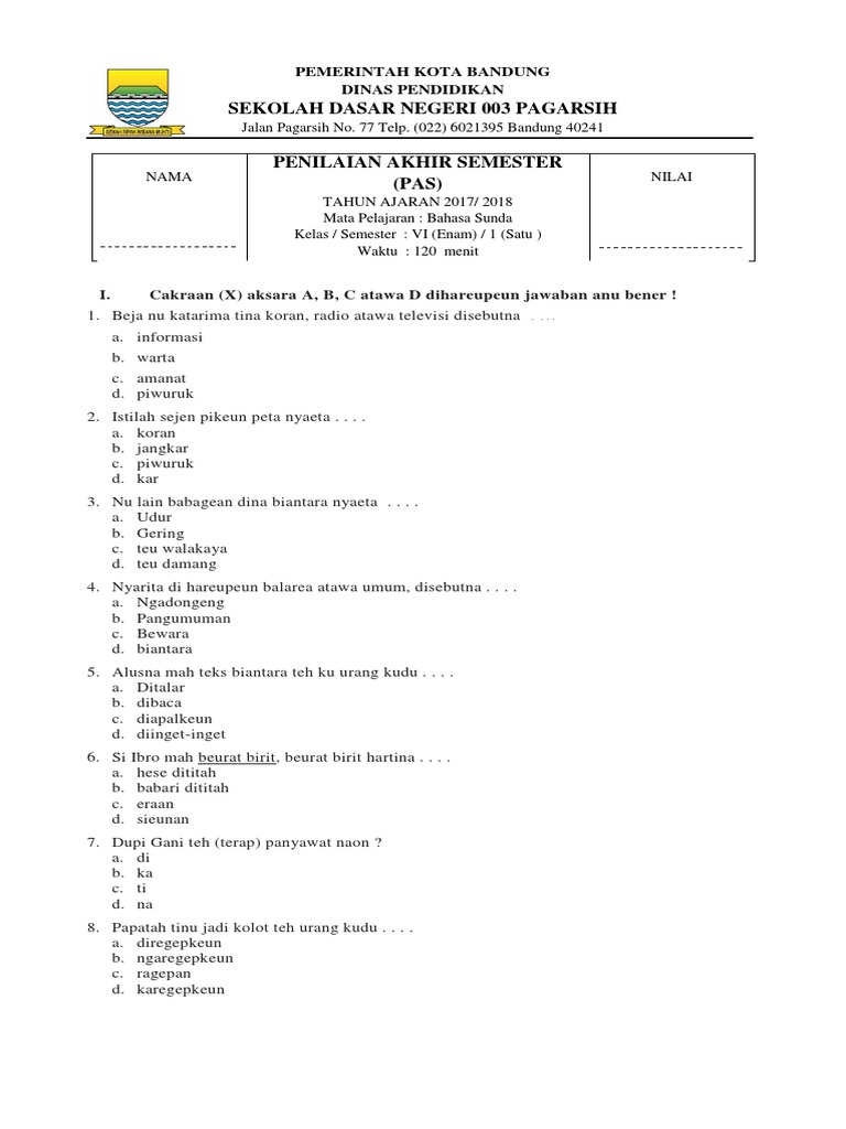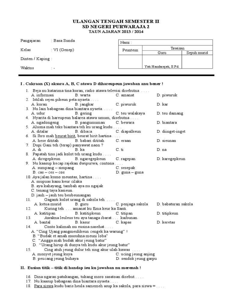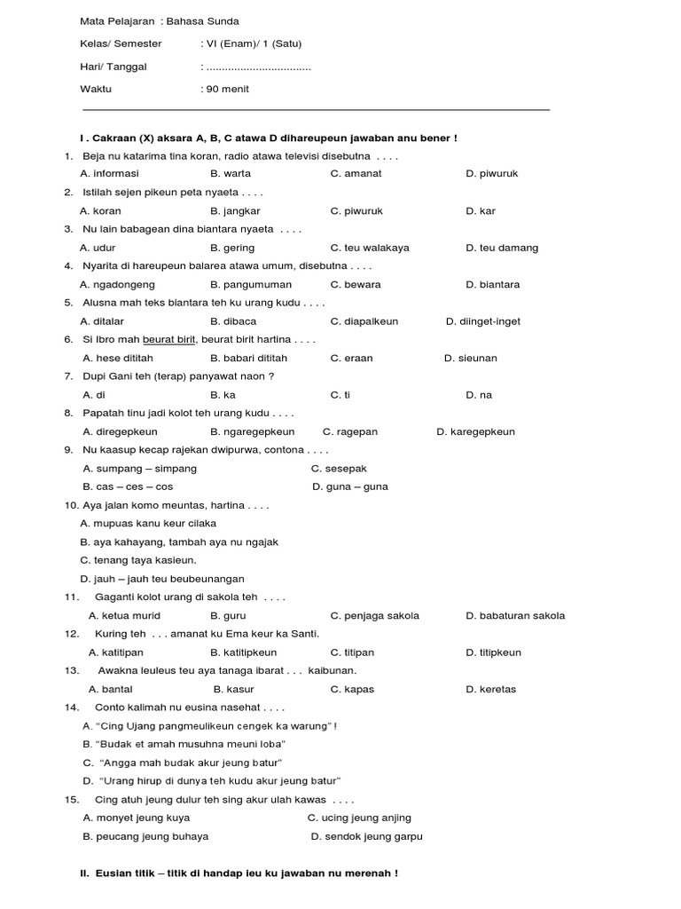 Soal UTS Bahasa Sunda Kelas 6 Semester 1.pdf - LATIHAN SOAL …