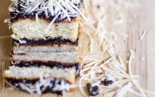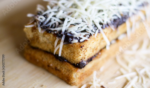 Scrummy cake from Yogyakarta, Indonesia. Topping cheese and chocolate. A blend of puff pastry and steamed brownies. - Buy this stock photo and explore similar images at Adobe Stock | Adobe Stock
