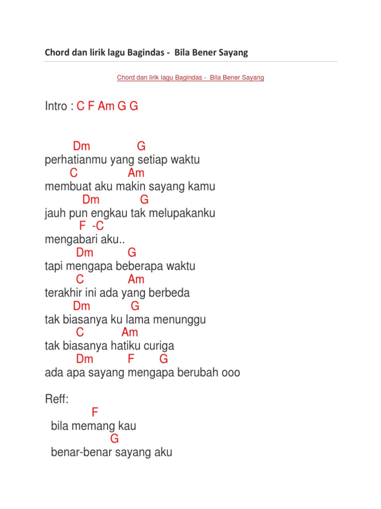 Chord Dan Lirik Lagu Bagindas - Bila Bener Sayang