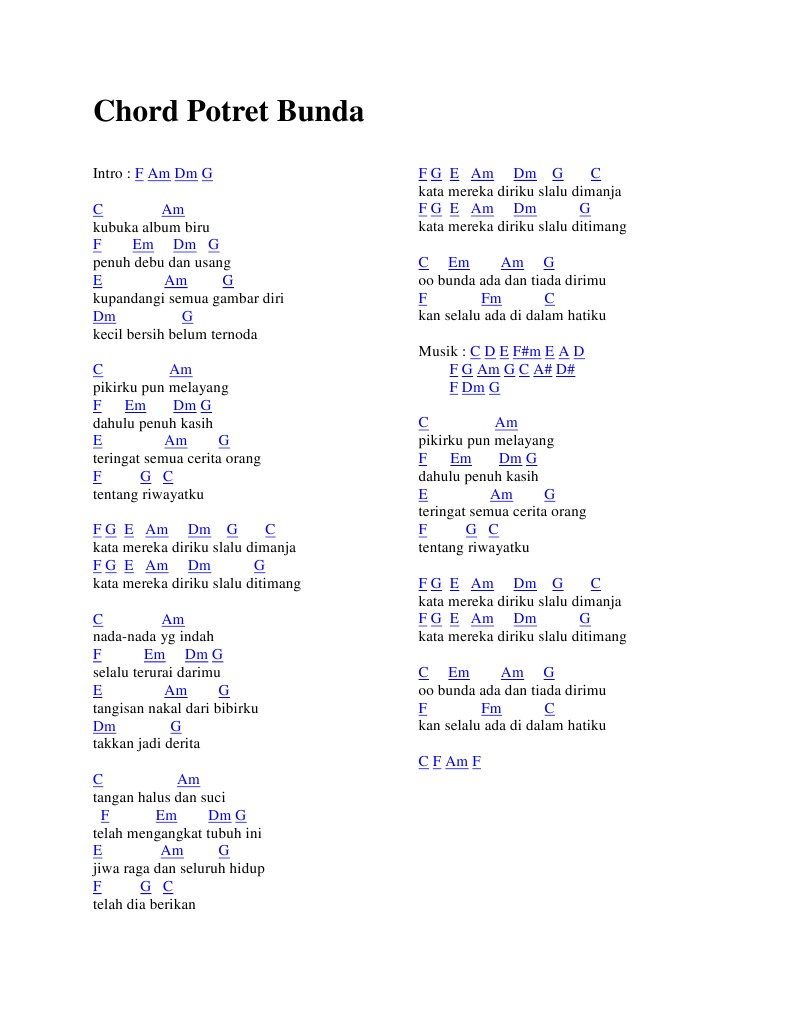 Kunci Gitar (Chord) Lagu Bunda - Potret, Kumpulan Lagu Peringatan …