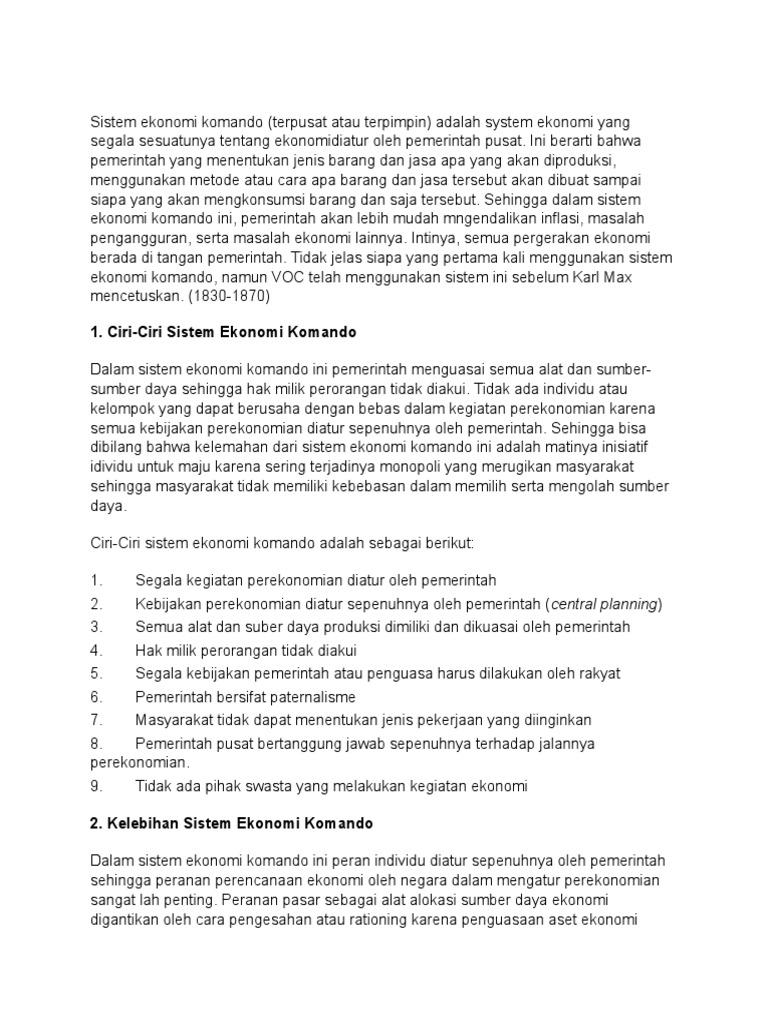 Apa saja ciri - ciri dari sistem ekonomi komando atau terpusat …