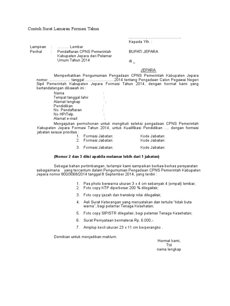 Contoh Surat Lamaran Cpns Formasi Tahun 2014