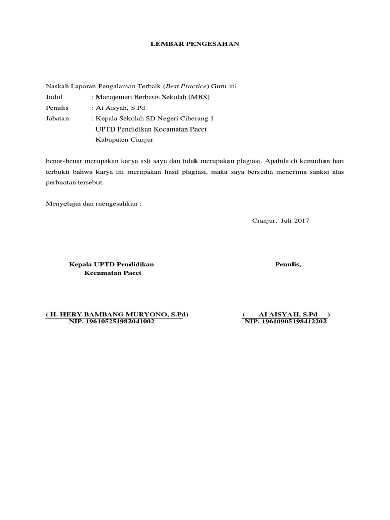 Lembar Pengesahan Best Practice | Matematika, Model pembelajaran, Kepala sekolah