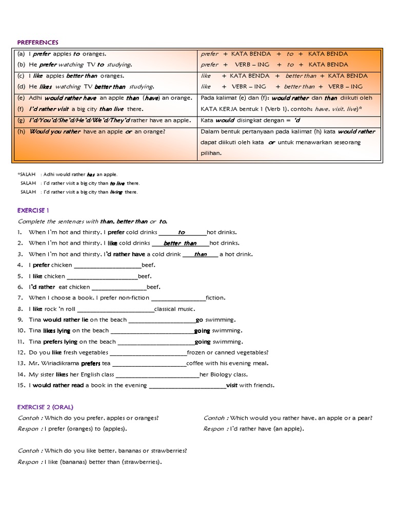 Menyatakan Preferensi: Prefer To, Rather Than, Would Rather Than, Better Than | Sederet.com