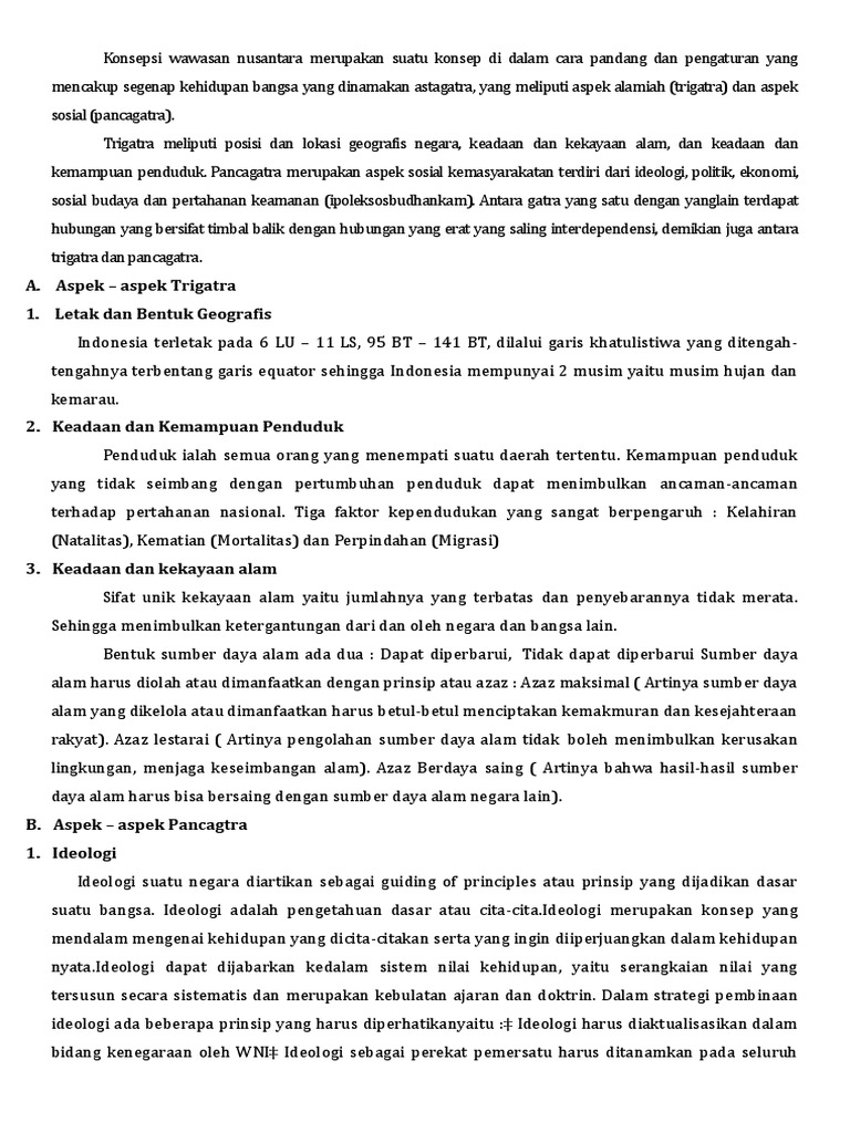 Konsepsi wawasan nusantara merupakan suatu konsep di dalam cara pandang dan pengaturan yang mencakup segenap kehidupan bangsa yang dinamakan astagatra.docx