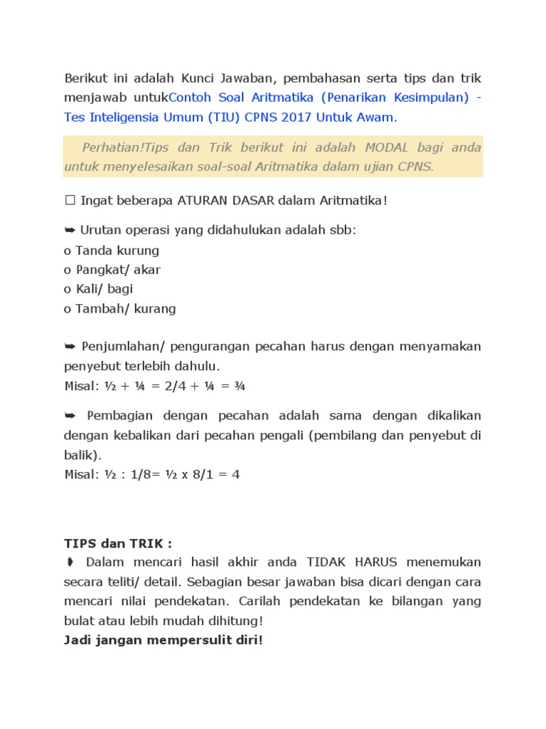 Kunci Jawaban Soal Aritmatika - Tes Intelegensia Umum (TIU) CPNS …
