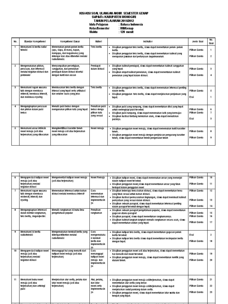 Kisi-kisi PAT Bahasa Indonesia SMP Kelas 7 Kurikulum 2013 …