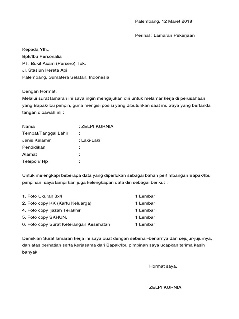 Contoh lamaran kerja 2018