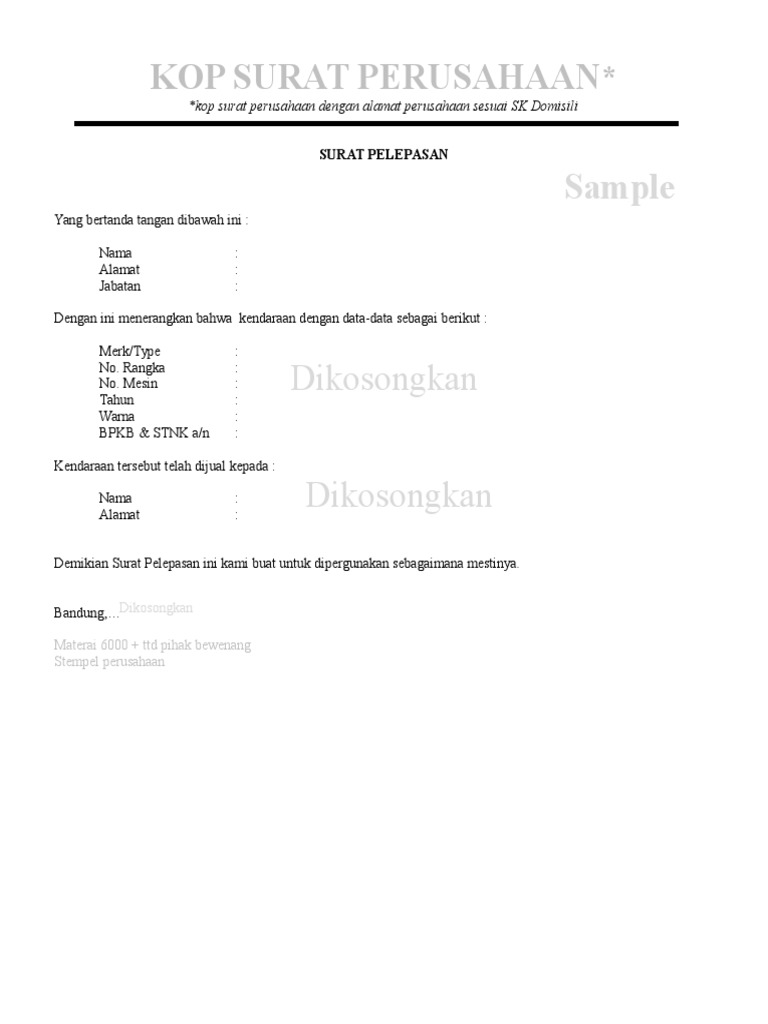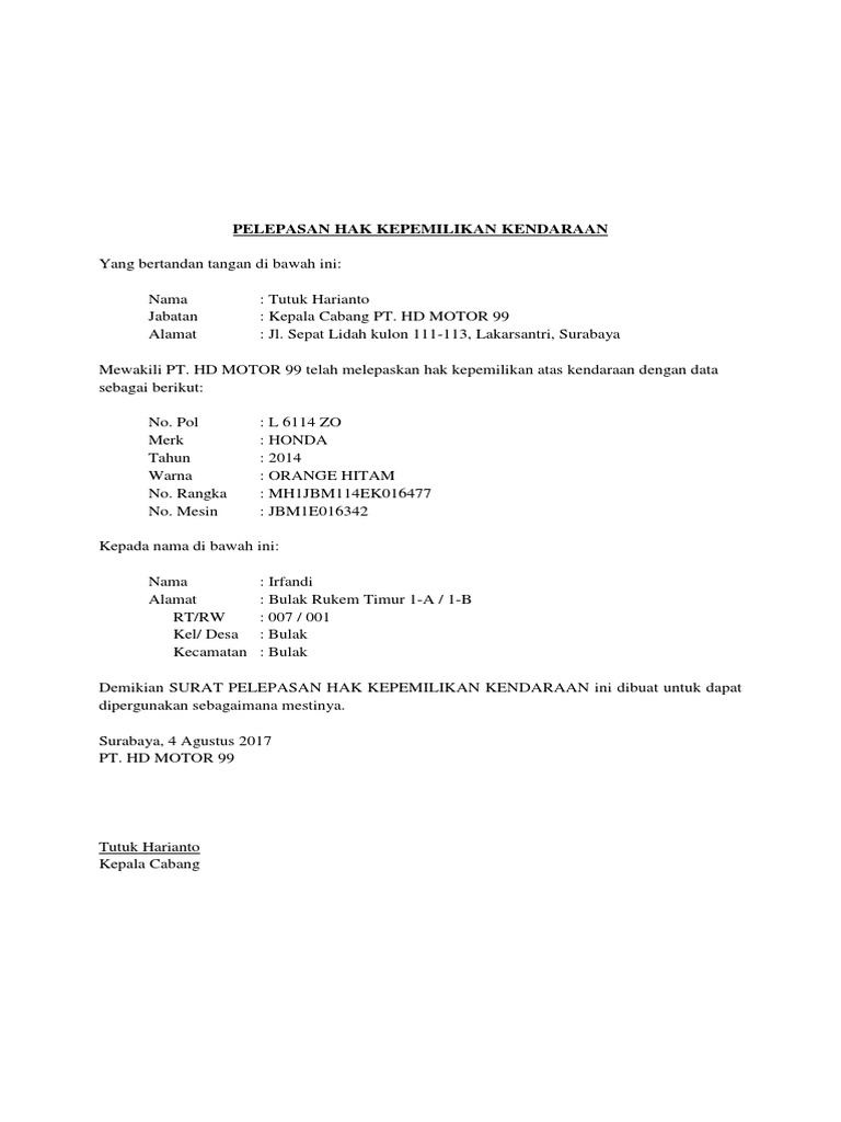 Contoh Surat Pelepasan Hak Kendaraan Bermotor Perusahaan - Contoh …