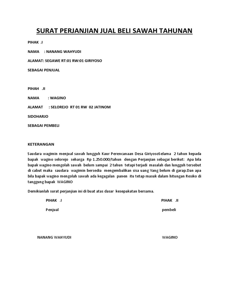 Contoh Surat Perjanjian Jual Beli Sawah - Gawe CV