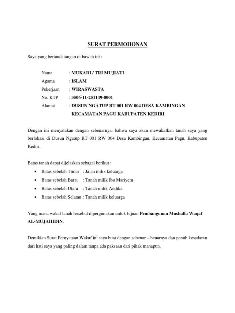 Contoh Surat Pernyataan Wakaf Tanah Dan Format Surat Untuk …