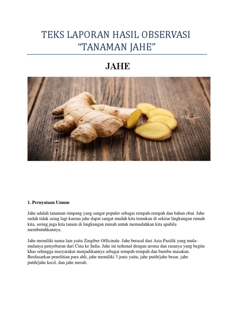 Teks Laporan Hasil Observasi “Tanaman Jahe”: 1. Pernyataan Umum