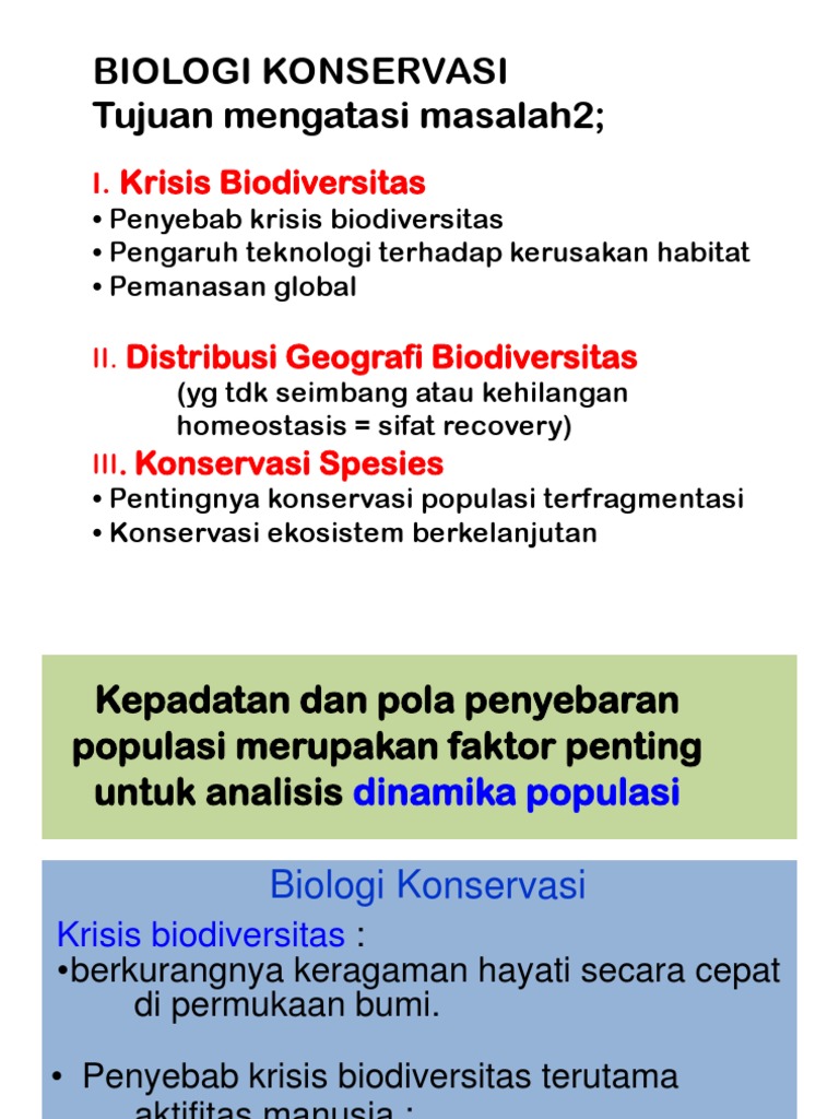 Biologi Konservasi Tujuan mengatasi masalah2;: I. Krisis Biodiversitas