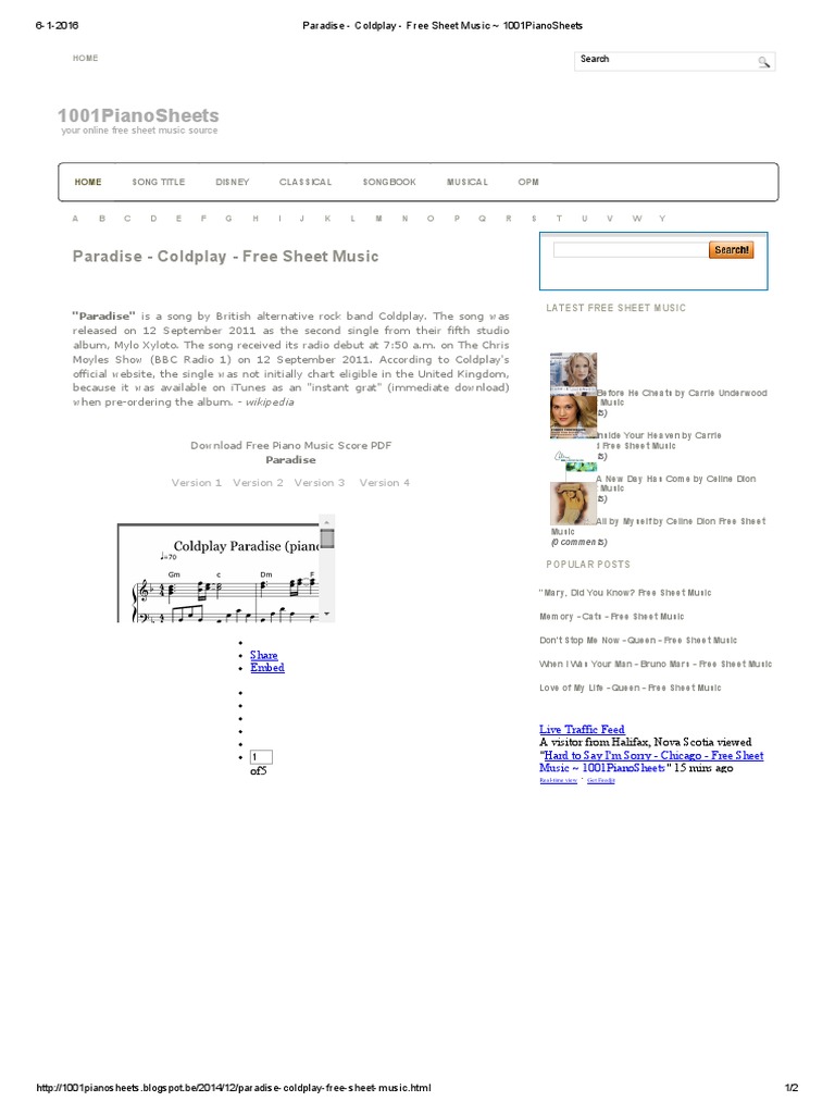 Paradise - Coldplay - Free Sheet Music _ 1001PianoSheets | Artists | Performing Arts
