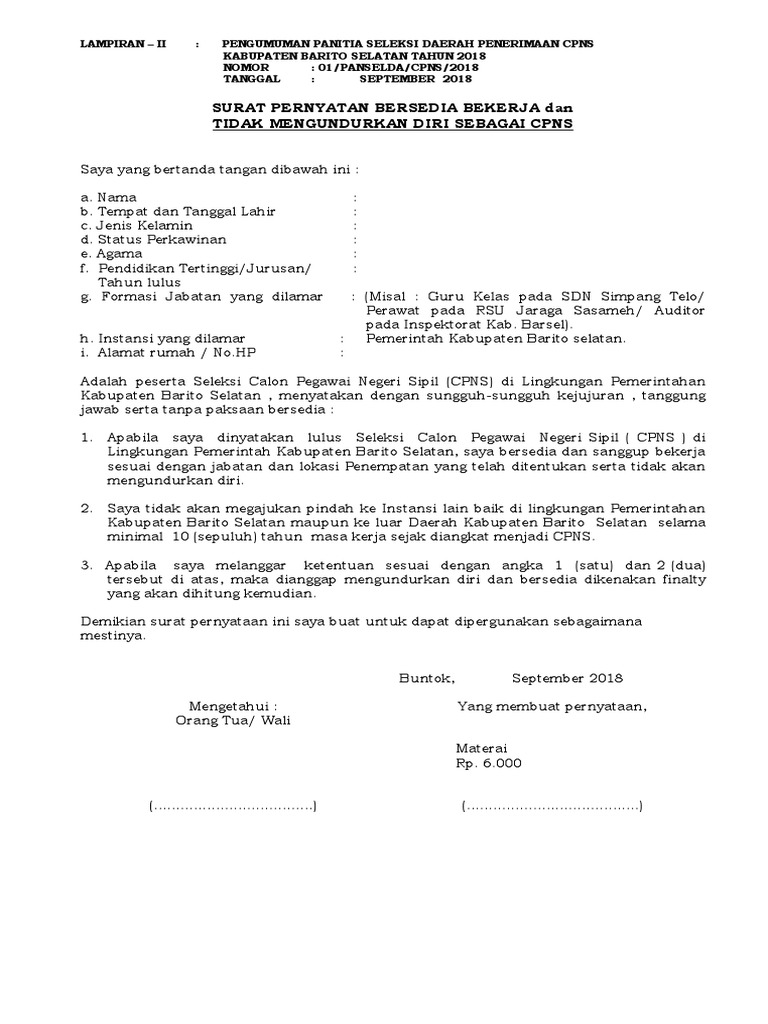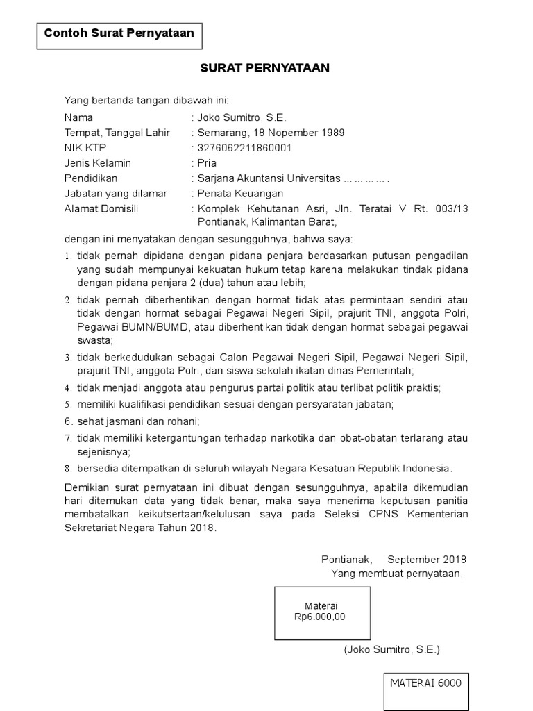 Contoh Surat Pernyataan CPNS 2018 | Download Format Surat Lamaran CPNS