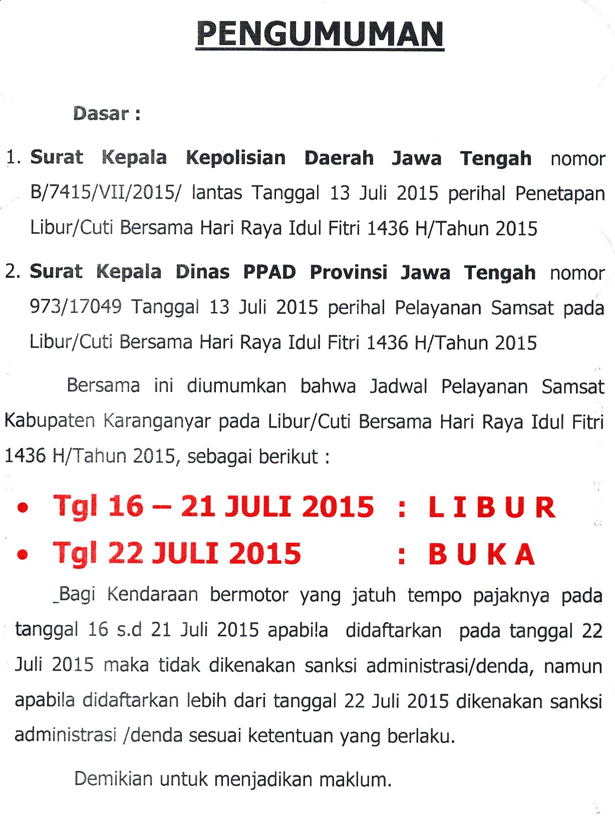 UPPD/SAMSAT KARANGANYAR on Twitter: “PENGUMUMAN LIBUR/CUTI BERSAMA HARI RAYA IDUL FITRI 1436 H TAHUN 2015. http://t.co/XqUOLFw06O”