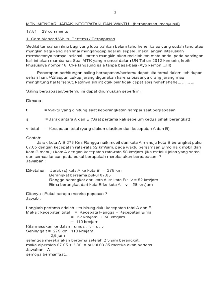 Contoh Soal Hubungan Jarak Waktu Dan Kecepatan - Berbagi Contoh Soal