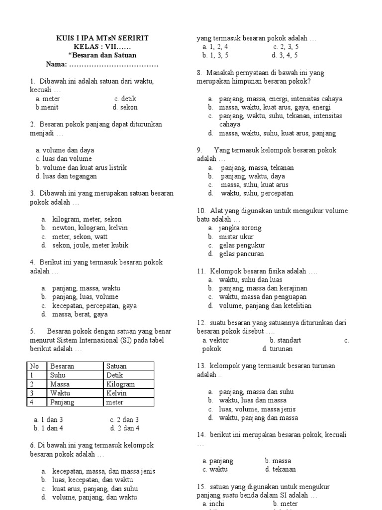 Soal Soal Pengukuran Besaran Dan Satuan Plus Kunci Jawaban
