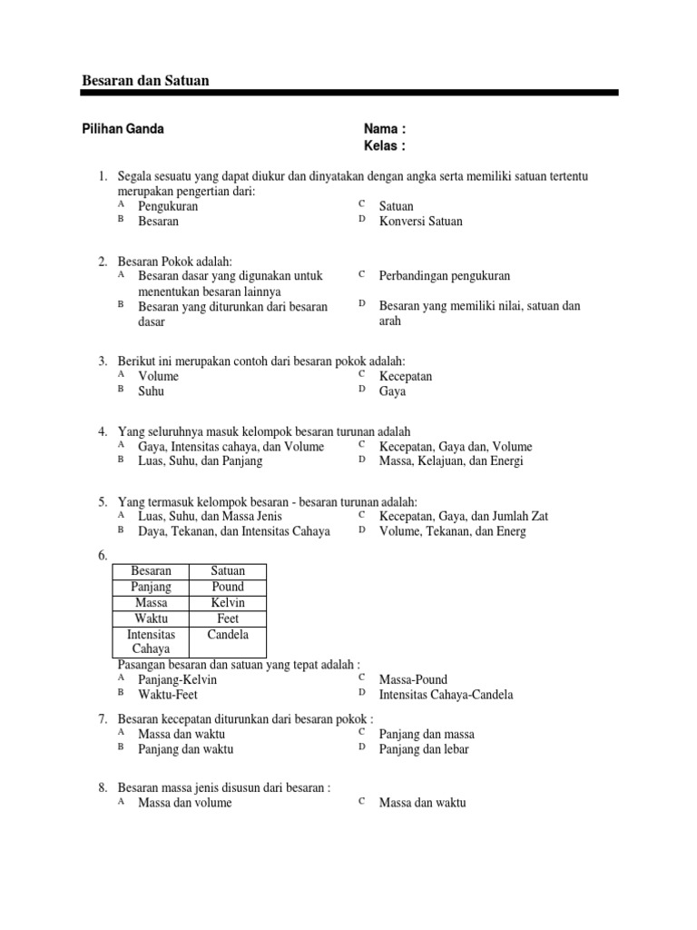 Besaran dan Satuan: Pilihan Ganda Nama: Kelas