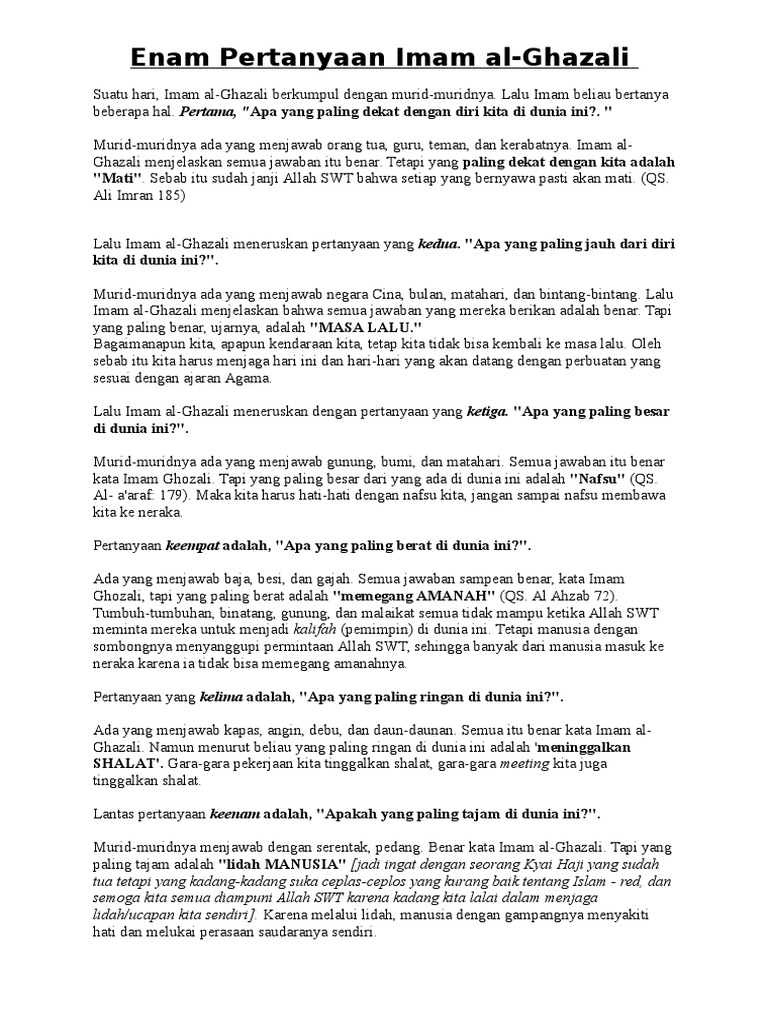 Enam Pertanyaan Imam Algazali