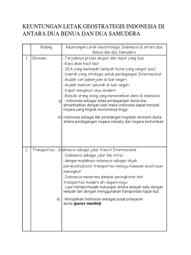 sebutkan 5 keuntungan letak geostrategis indonesia di antara dua …