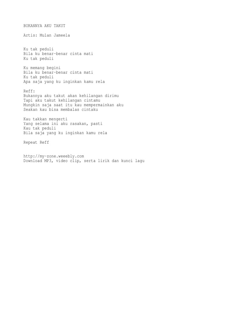 BUKANNYA AKU TAKUT” LYRICS by MULAN JAMEELA: Ku tak peduli Bila…