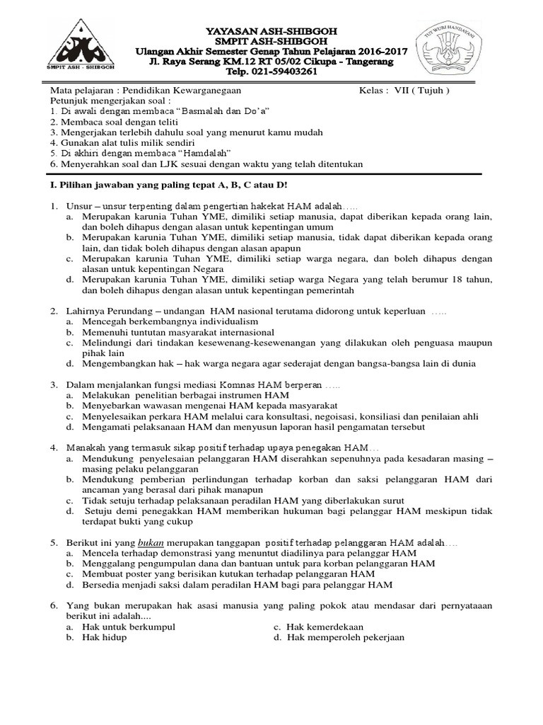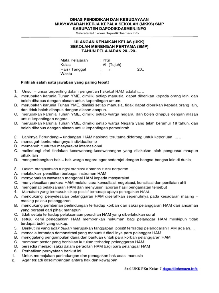 Soal UKK PKN Kelas 7 Beserta Jawaban | Informasi Guru Kelas