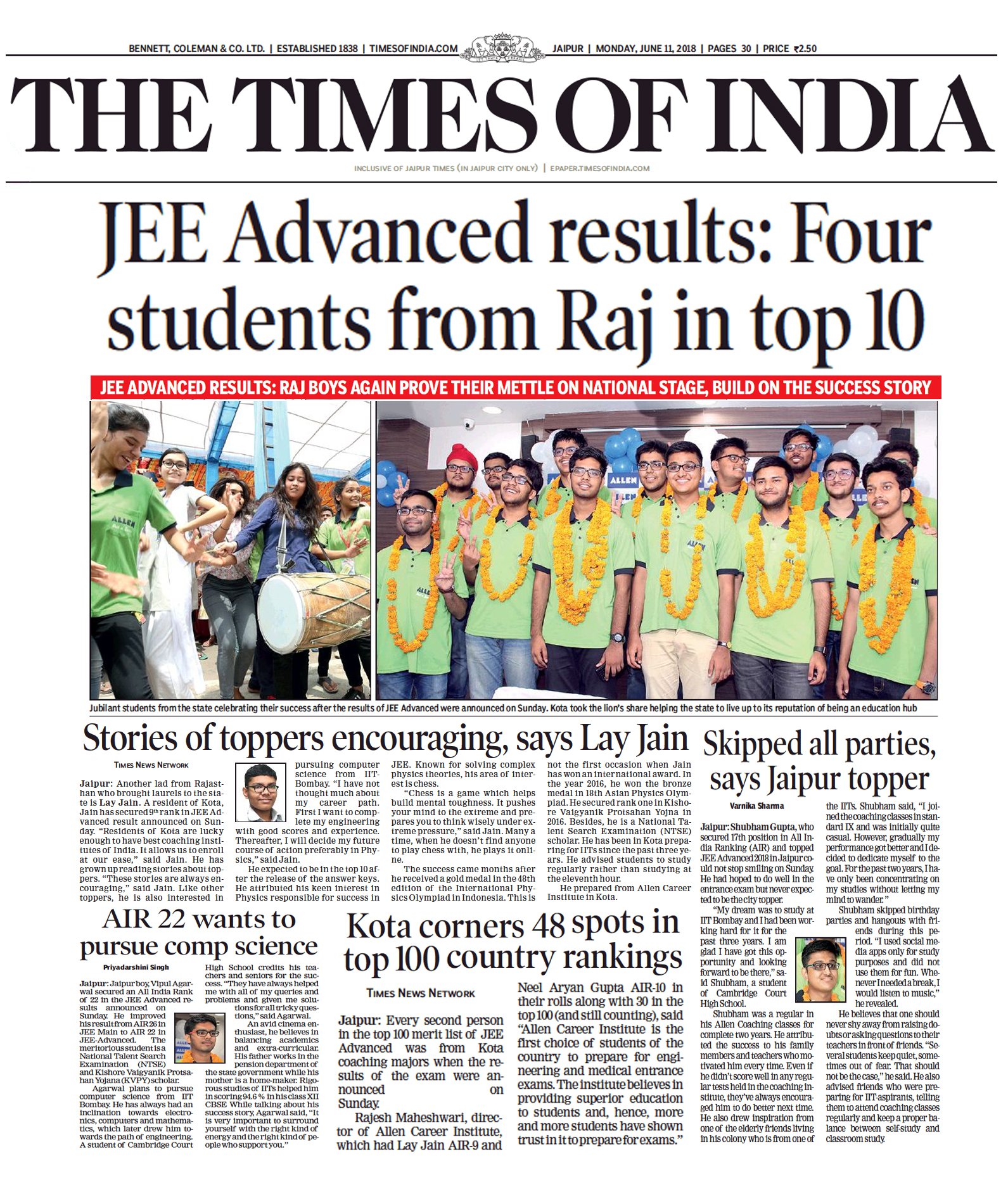 Uživatel ALLEN Career Institute na Twitteru: „📢Students of ALLEN Career Institute outshines #JEEAdvanced2018 ALLEN Consistently Delivering Best Results in Quality & Quantity✌️ 30 in Top 100 AIR 👉AIR-9: Lay Jain (Classroom) 👉AIR-10: