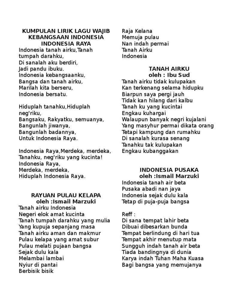 Kumpulan lirik lagu wajib kebangsaan indonesia