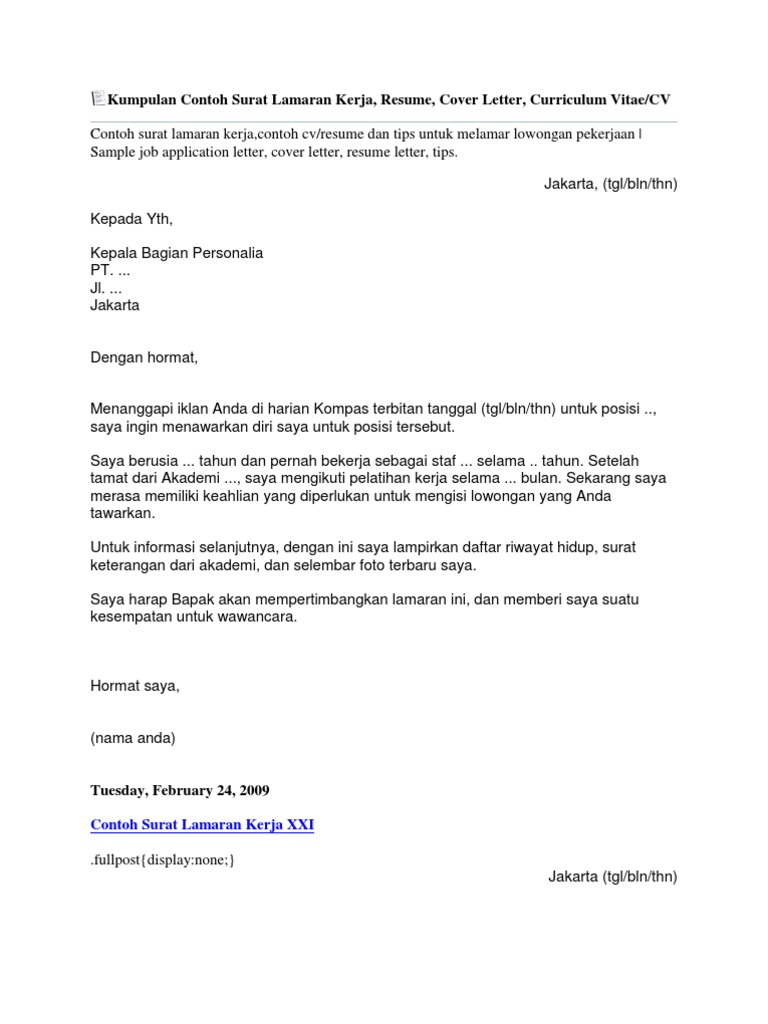 82 Contoh Surat Lamaran Kerja Ke Xxi