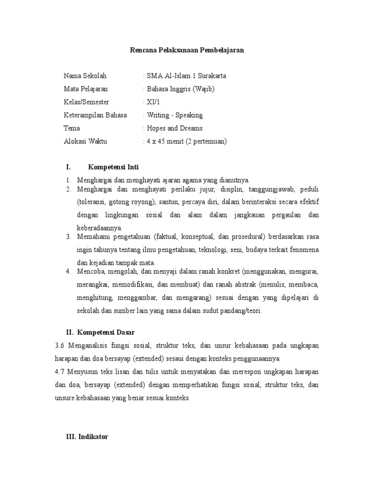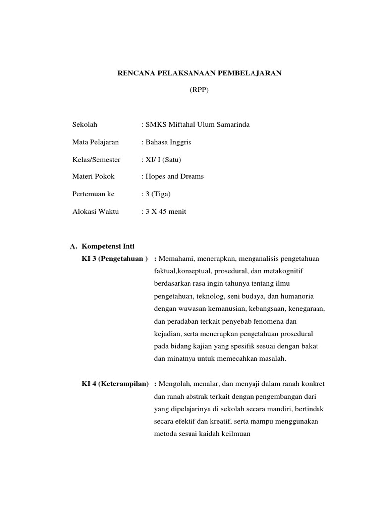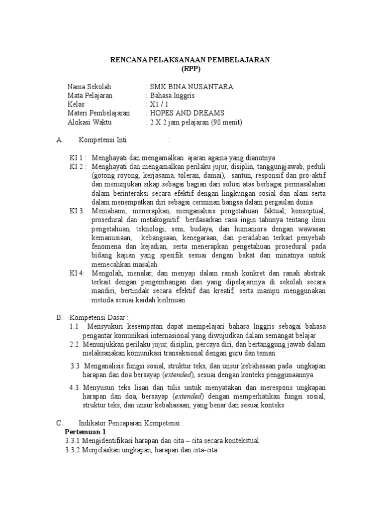 Rpp Bahasa Inggris SMK kelas XI reading speech hopes and dream