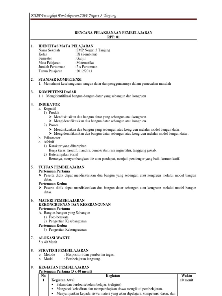 RPP 1 Lembar MTK Kelas 9 SMP/MTs - antapedia.com