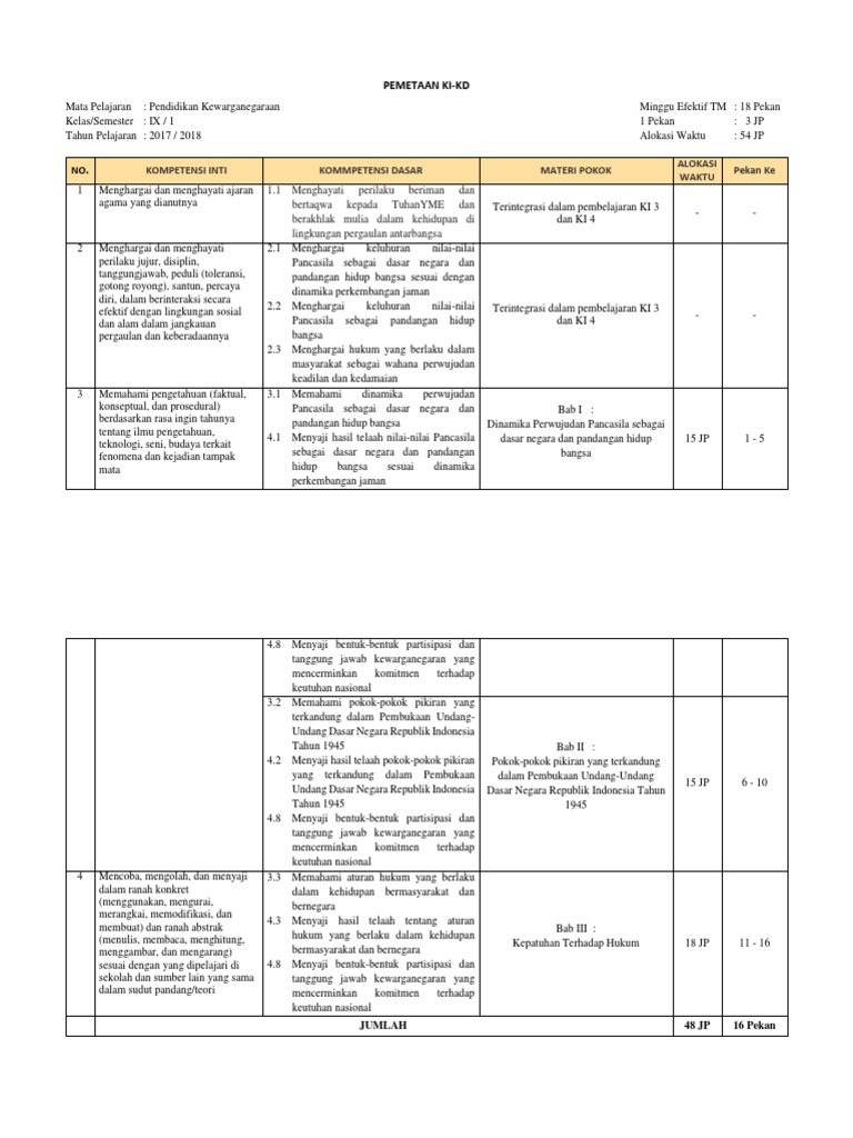 Pemetaan Ki- Kd Pkn Kelas 9 2017