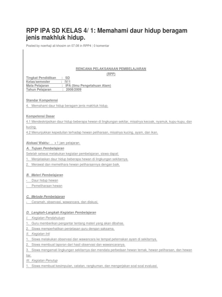 Rpp Ipa Sd Kelas 4 Daur Hidup