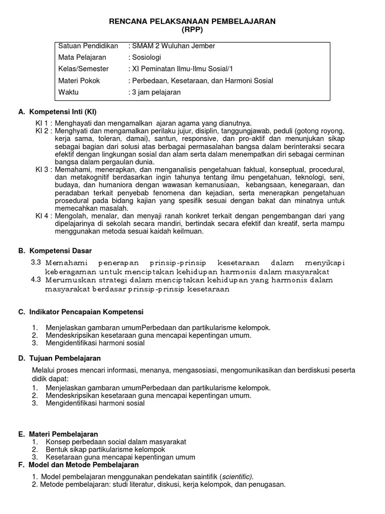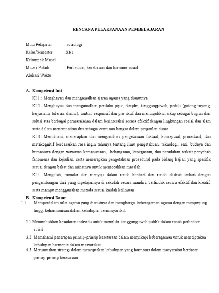 DOC) RPP Sosiologi Perbedaan, kesetaraan, dan Harmoni Sosial | Ade …