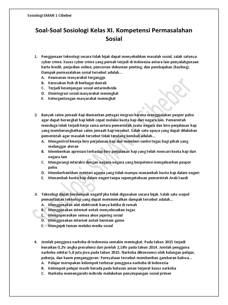 4. Soal-Soal Sosiologi Kelas XI. Kompetensi Permasalahan Sosial