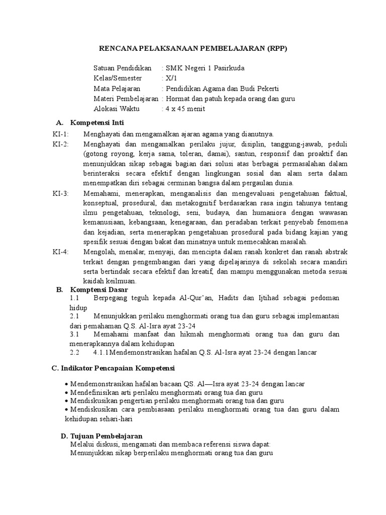 Rpp Hormat Dan Patuh Kepada Orang Tua Dan Guru