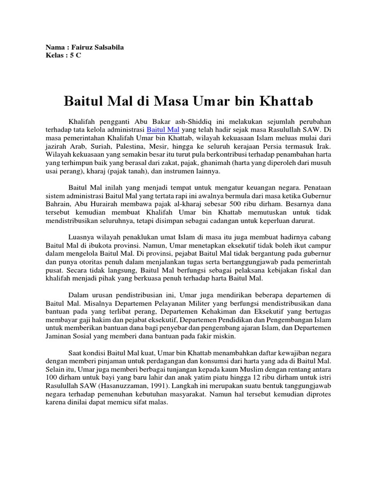 Baitul Mal di Masa Umar bin Khattab: Nama: Fairuz Salsabila Kelas: 5 C