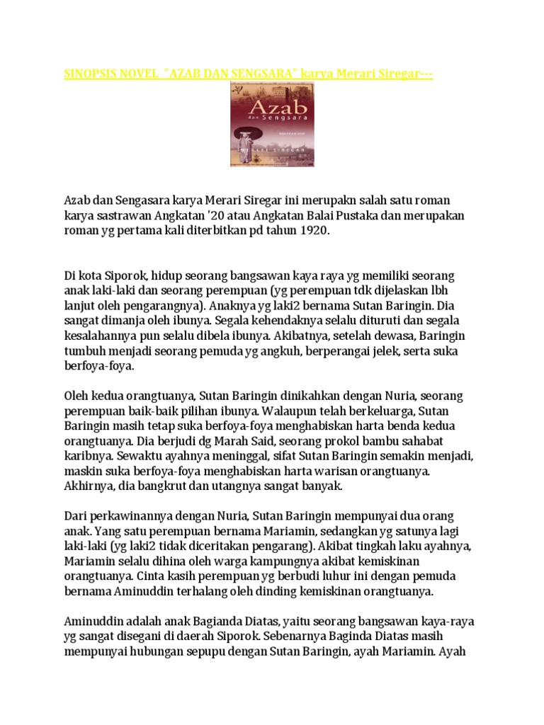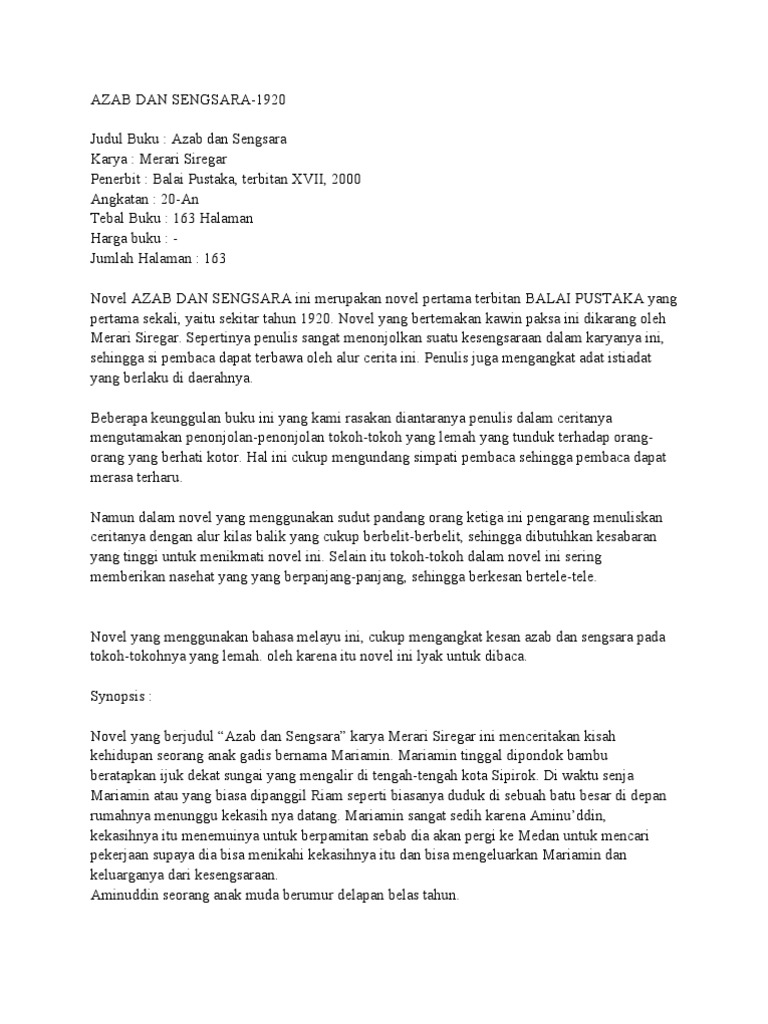 Sinopsis Novel Azab dan Sengsara - PELAJARAN BAHASA INDONESIA DI …