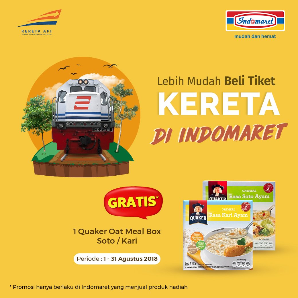 Indomaret on Twitter: “Lebih mudah beli tiket kereta api @KAI121 di Indomaret GRATIS 1 QUAKER Oat Meal Box Soto.Kari selama periode 1-31 Agustus 2018. #iTiket #indomaret… https://t.co/ac0XIusIv3”