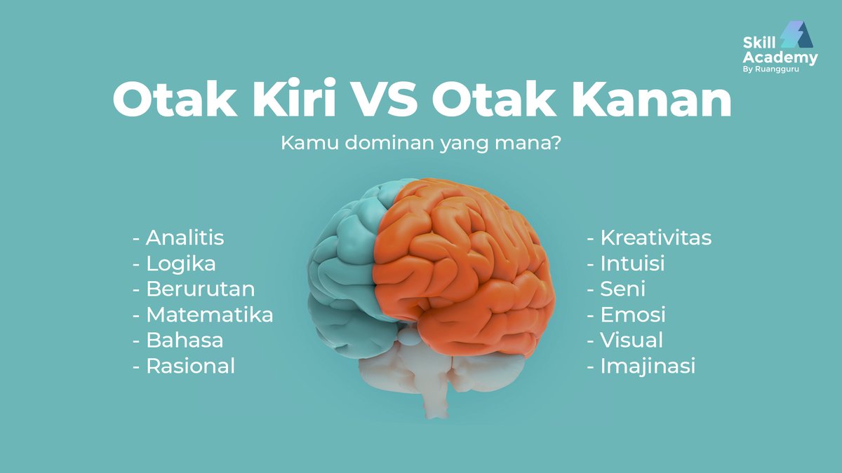 Skill Academy by Ruangguru on Twitter: “Kamu lebih dominan di sisi yang mana? Lebih dominan otak kiri atau otak kanan sama baiknya kok. Pilihannya ada di tanganmu, apakah kamu mau memaksimalkan sisi