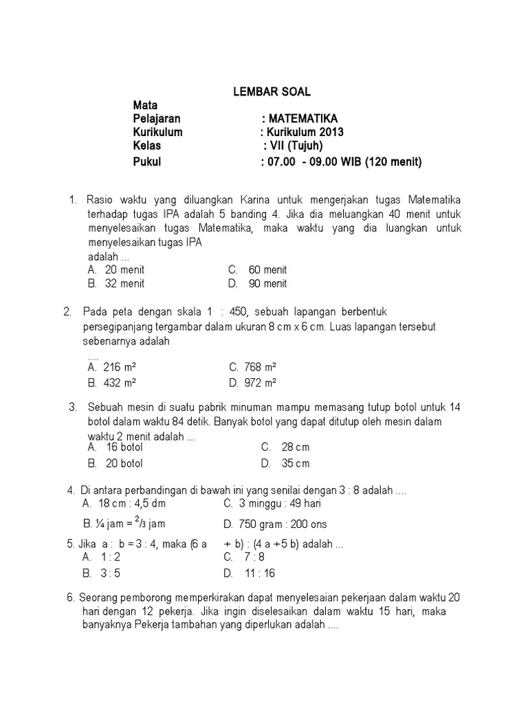 Soal dan Kunci Jawaban PAT Matematika SMP Kelas 7 Kurikulum 2013 …