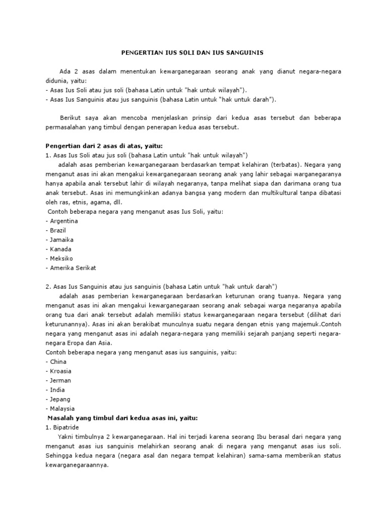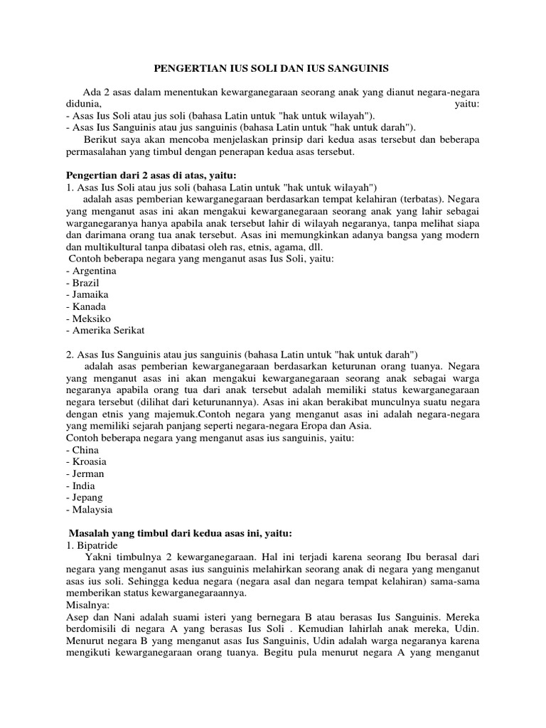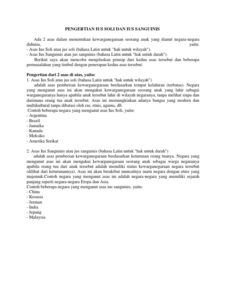 Asas Kewarganegaraan (Asas Ius Soil, Lus Sanguinis, Bipatride Dan Apatride) | Tugas Sekolah