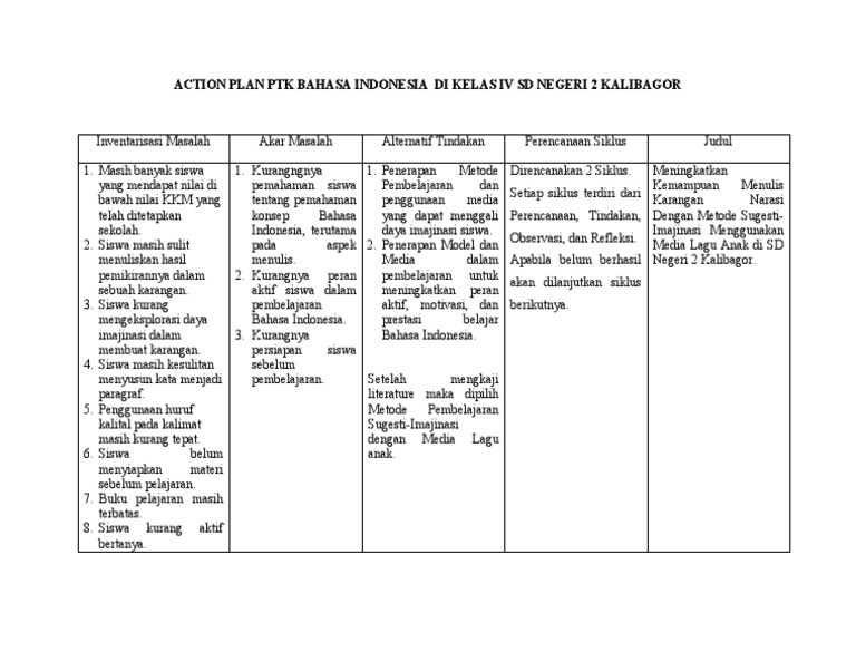 Action Plan Ptk Bahasa Indonesia Di Kelas IV Sd Negeri 2 Kalibagor