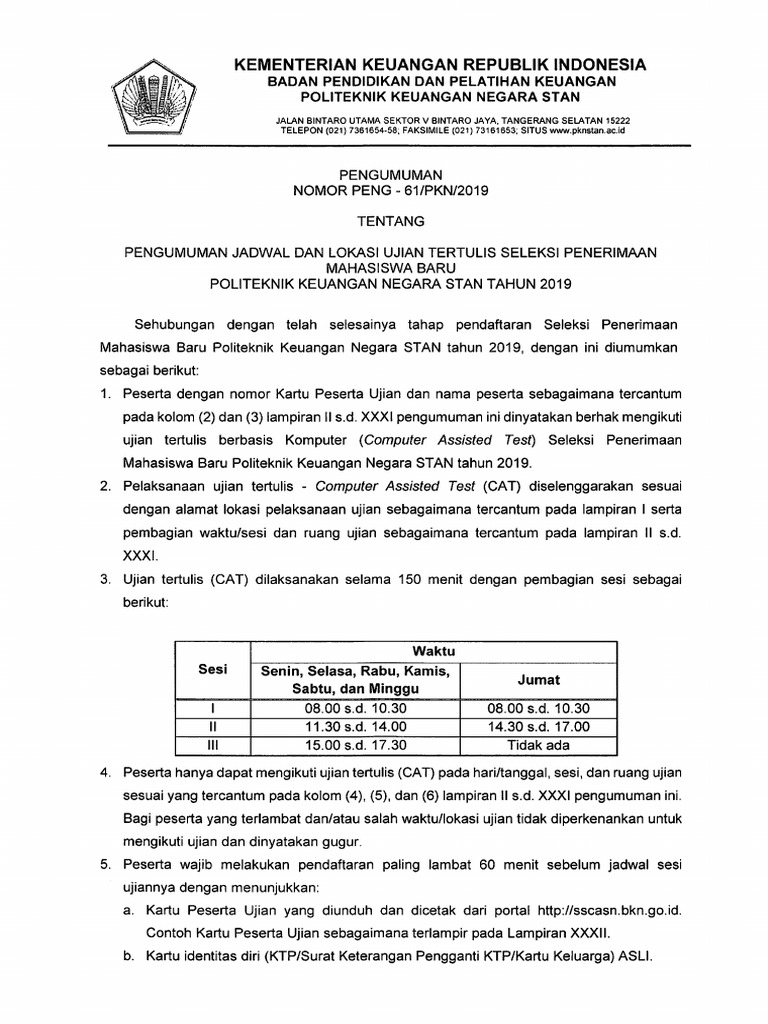 Pengumuman Jadwal Dan Tempat Ujian Tertulis Pkn Stan 2019 - Sebuah …
