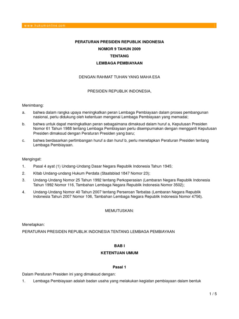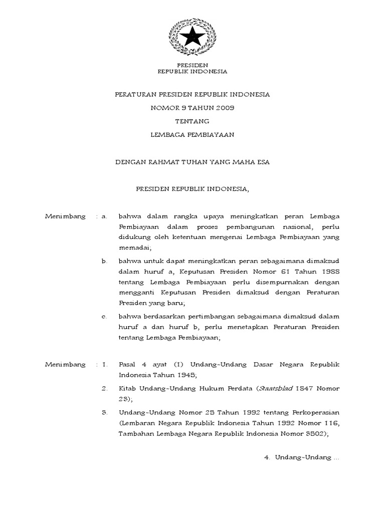 Peraturan Presiden Nomor 9 Tahun 2009 Tentang Lembaga Pembiayaan